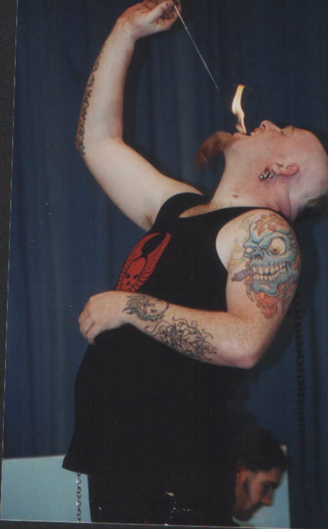 5lb weights from earlobes, route 66, route 66 aftermath, fire breathing, fire eating, more aftermath.